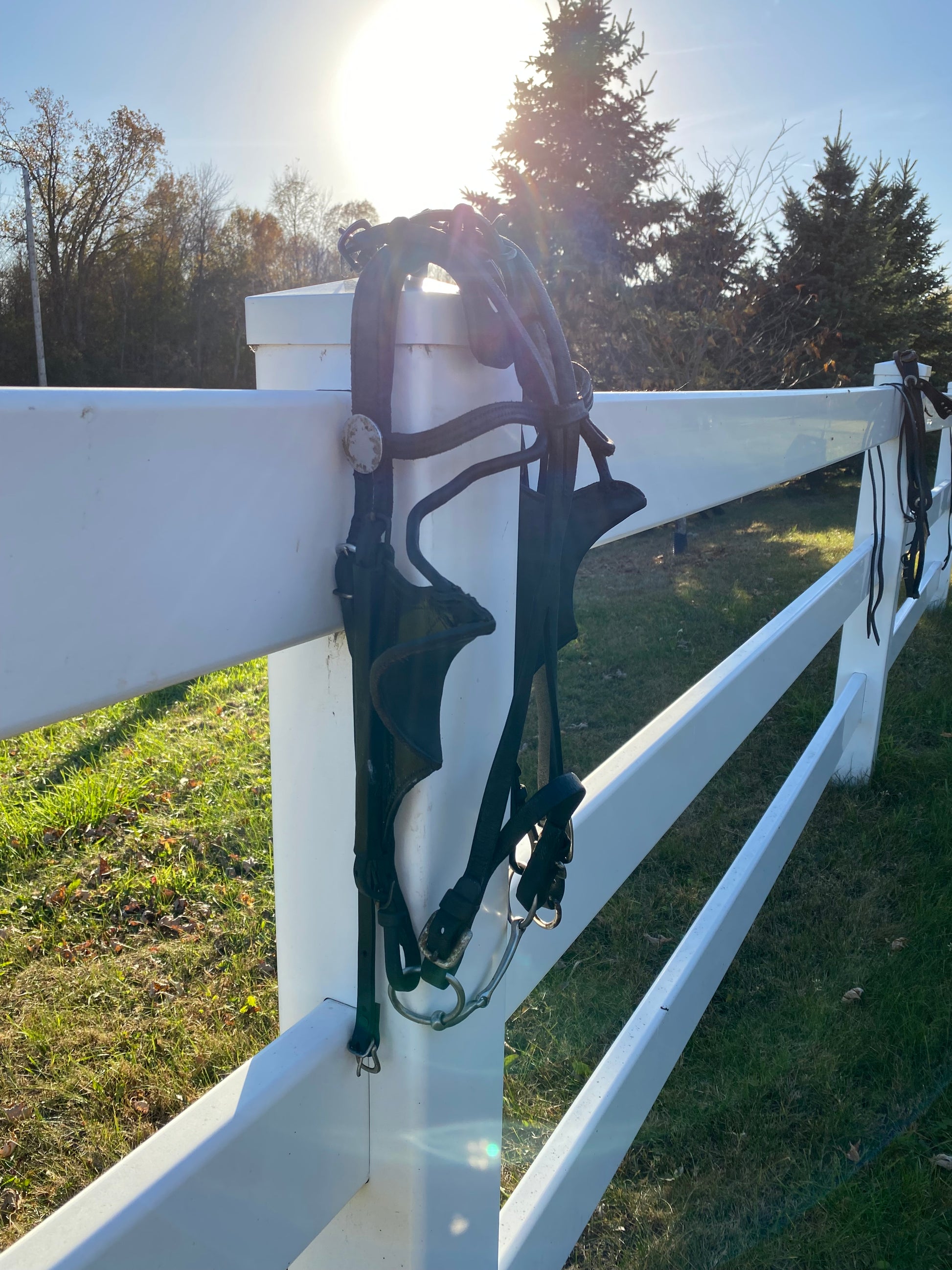 This vintage donkey harness bridle with blinders is in good, pre-owned condition. This is such a cool driving bridle! Comes with snaffle bit.